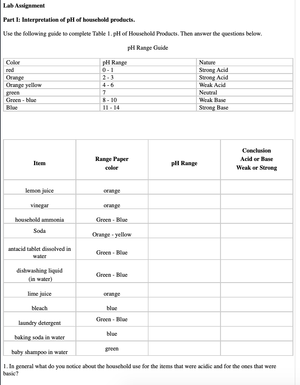 Answer in General Chemistry for Hafeni Haukena #122990 - Assignment Expert The solution will turn red if it is acidic and green if it is basic. Record all your results in a data table. Questions: 1. Are cleaning products acids, bases, or none? ... Did you find consumer warning labels on acidic or basic products? Expert's answer. Dear Hafeni Haukena, your question requires a lot of work, which neither of our experts is ...